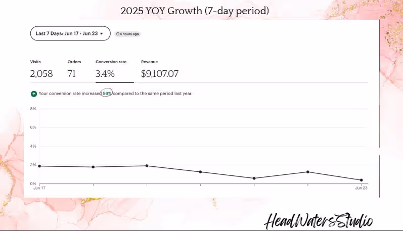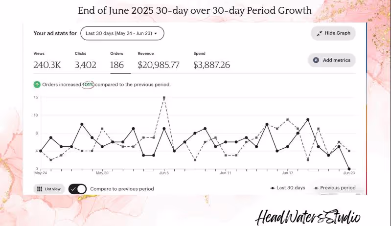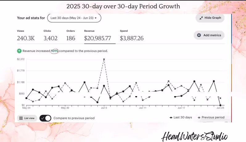 HeadWatersStudio.etsy.com reached an impressive $2.7 million in sales by June 2025. Through a clear focus on product mix, brand values, targeted SEO, competitive pricing, and polished visuals, the shop established itself as a market leader. In September 2025, we saw impressive 30-day over 30-day growth→ 103% increase in revenue. 104% increase in orders. $47,848 30-day revenue. Year-over-year growth showed a 96% increase in orders. 54.3% increase in conversion rate. 58% increase in revenue. All snapshots here.